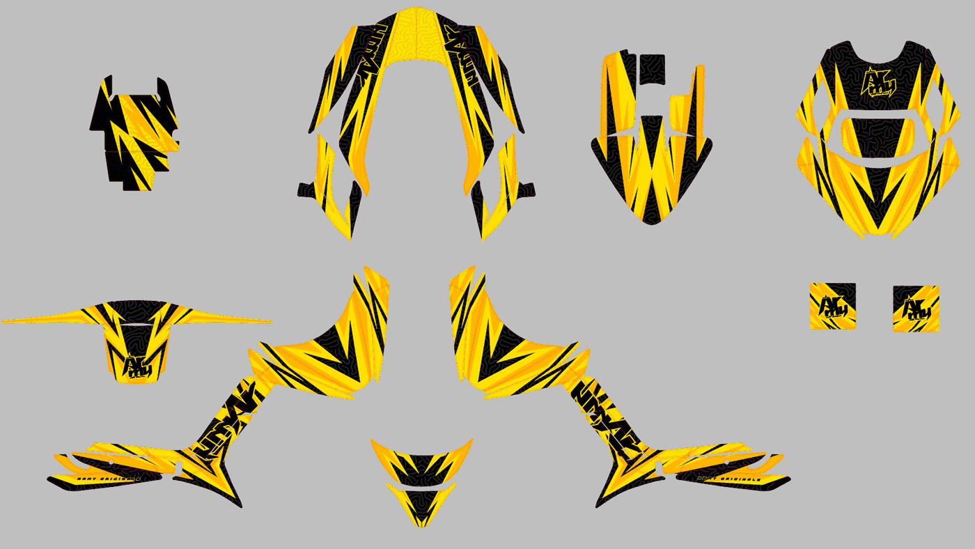 Le Kit Déco Delta redéfinit l'esthétique de votre MBK Booster ou Yamaha BW's. Conçu spécifiquement pour sublimer les courbes agressives des carénages BCD RX, ce modèle joue sur la superposition de formes triangulaires et de lignes de vitesse.