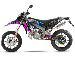 Die Aprilia SX 50 ist die Erbin des Könnens aus Noale, und unsere Dekorationssets entsprechen diesem Ruf. Wir haben äußerst präzise Schablonen entwickelt, die alle Generationen dieser ikonischen Maschine abdecken. Für Besitzer der Aprilia SX und RX (Modelle 2006 bis 2017) passen unsere Sets perfekt zu den scharf gezeichneten Verkleidungen im Originalstil von Derbi. Wenn Sie die neueste Version besitzen, die Aprilia SX / RX (Modelle 2018 bis 2026), berücksichtigen unsere Designs die neuen Formen der Seitenplatten und des Schutzblechs. Durch die Verwendung eines hoch haftenden Vinyls mit UV-Schutz garantieren wir, dass Ihr Set auch nach jahrelanger Sonneneinstrahlung nicht verblasst und gleichzeitig Ihre Kunststoffteile vor Abrieb und Spritzern schützt.