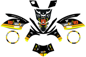 Ob Sie einen Klassiker restaurieren oder Ihr Alltagsfahrzeug individuell gestalten möchten, unsere Dekorationssets für 50cc Roller bieten eine unvergleichliche Schnittgenauigkeit. Wir beherrschen die komplexen Verkleidungen der Ikonen dieses Segments: von den legendären MBK Booster und Yamaha BW's, bis zu den sportlichen MBK Nitro und Yamaha Aerox. Unser Katalog umfasst auch die unverzichtbaren Stadtmodelle wie den Piaggio Zip, den Kymco Agility sowie die gesamte Peugeot-Reihe mit den Peugeot Kisbee, Speedfight und dem zeitlosen Trekker. Unsere hochwertigen Folien sind so gefertigt, dass sie sich den geschwungenen Formen der Rollerkarosserien anpassen und gleichzeitig einen robusten Schutz gegen Kratzer im Stadtverkehr und UV-Strahlen bieten.