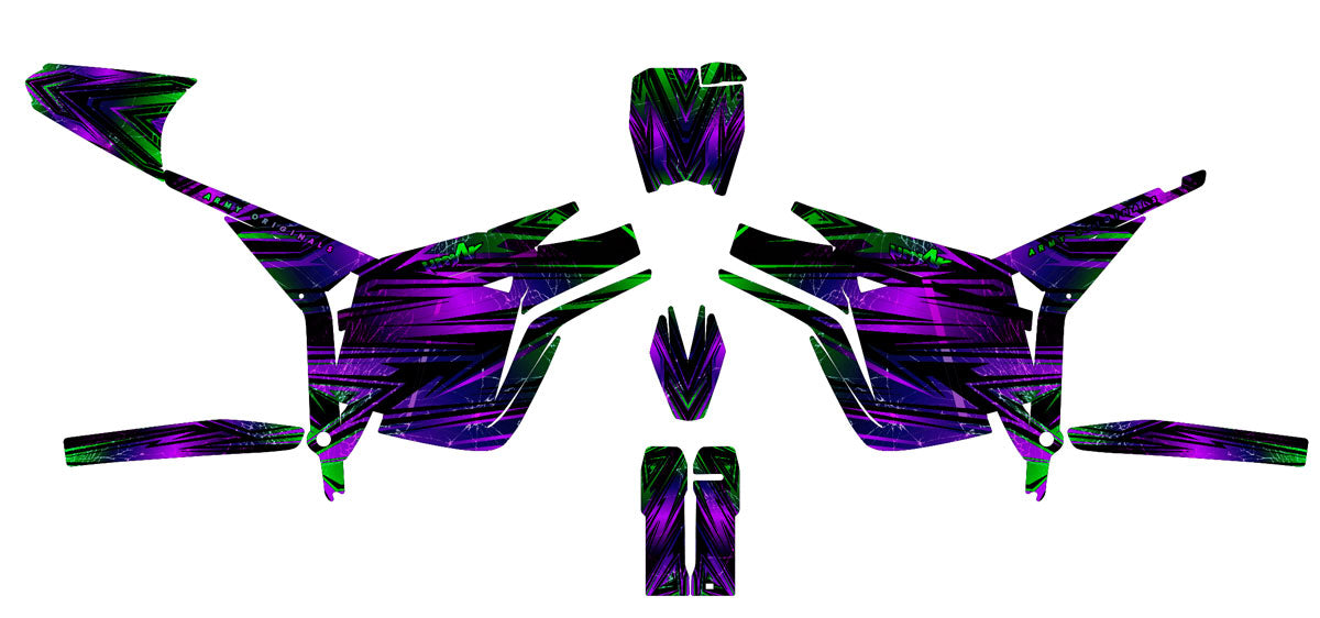 Unsere Basissätze enthalten die Lüftungsschlitze, Platten, Schutzbleche und Gabelschutz. Zusätzlich bieten wir passende Designs für Felgenränder und Schwingarme an, um Ihrem Elektromotocross ein vollkommen stimmiges Erscheinungsbild zu verleihen.