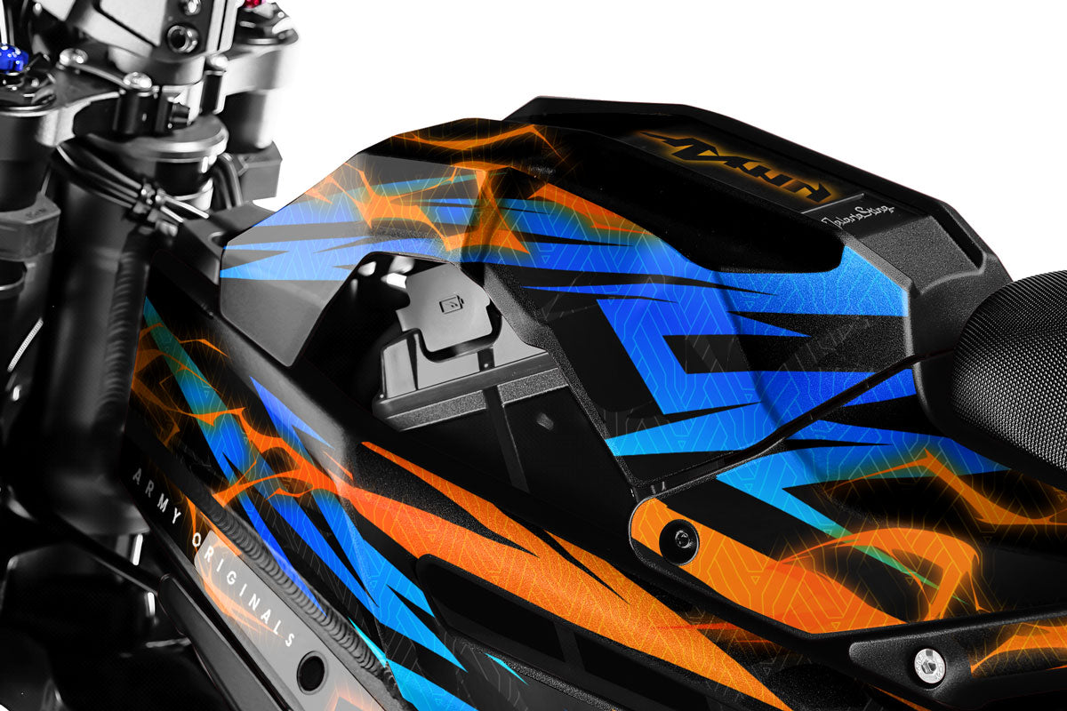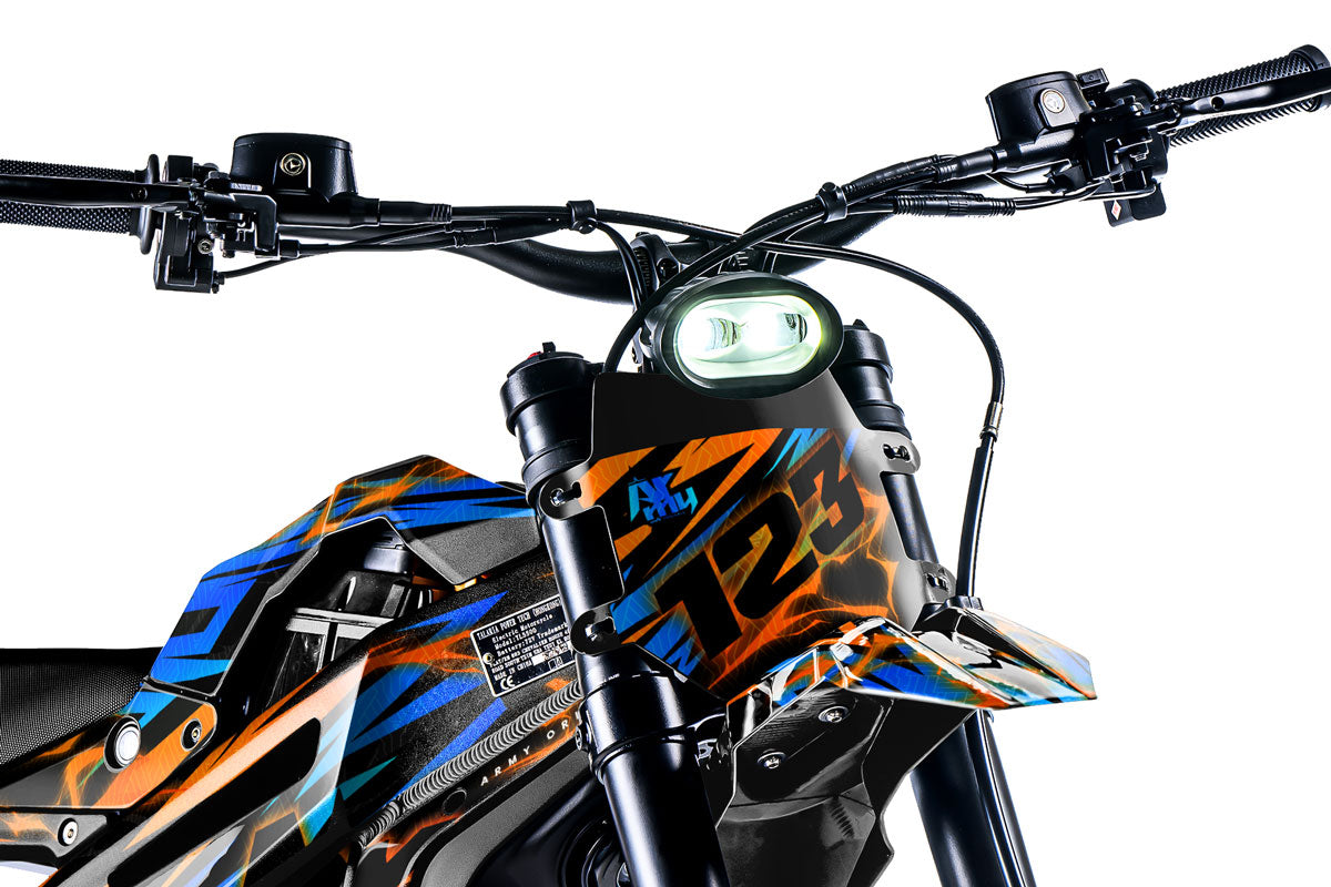Die Reihe Talaria Sting entwickelt sich rasch weiter, und unsere Gestalter passen ständig unsere Schablonen an, um mit diesen technischen Neuerungen Schritt zu halten. Ob Sie eine MX3 oder eine MX4 (Sting R) fahren, wir garantieren eine perfekte Abdeckung der seitlichen Flanken und der Standard-Batteriehaube, um eine makellose optische Kontinuität sicherzustellen. Für die Besitzer der neuen Talaria Sting MX5 wurden unsere Entwürfe vollständig überarbeitet, um sich den neuen Verkleidungen und den Besonderheiten des verstärkten Fahrgestells dieser Version anzupassen. Über die Optik hinaus bietet jedes Dekorationsset einen umfassenden Schutz durch die systematische Einbeziehung von Teilen für die Gabelschutz und den Schwingarm, Bereiche, die bei Geländefahrten mit diesen temperamentvollen Elektromotorrädern besonders anfällig für Stöße sind.
