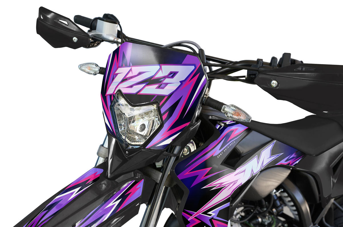 Our decoration kits are designed to withstand extreme conditions (motocross, enduro, road). We use a high-quality vinyl with a thickness between 300 and 450 microns (depending on the finish). This thickness ensures optimal protection of your fairings against scratches, gravel, and boot rubs.
