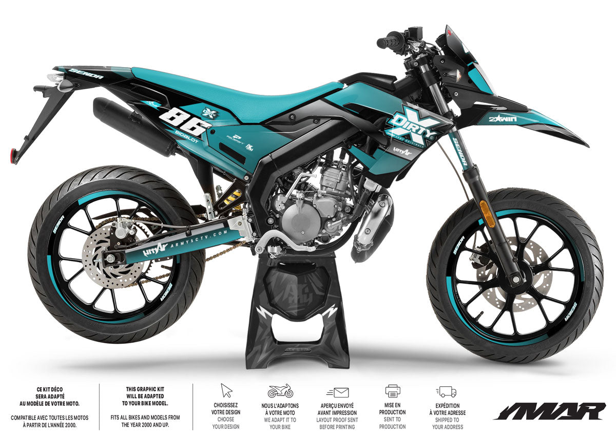 The Graphic decals for Derbi Senda X-treme SM 50cc is designed for supermotard enthusiasts looking for a modern design inspired by racing and performance patterns. With its bright colors and dynamic graphics, this deco kit gives your bike a sporty and striking look while providing optimal protection for your rides on the road and off-road.