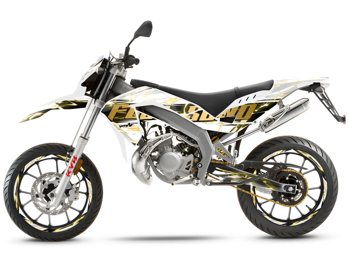 The Haymaker Graphics-kit is not here just for show. Intended for owners of Aprilia SX and RX (2006-2017 generation), this design takes its name from a powerful punch. It is crafted to add volume and fierceness to the lines of this iconic motorcycle.
