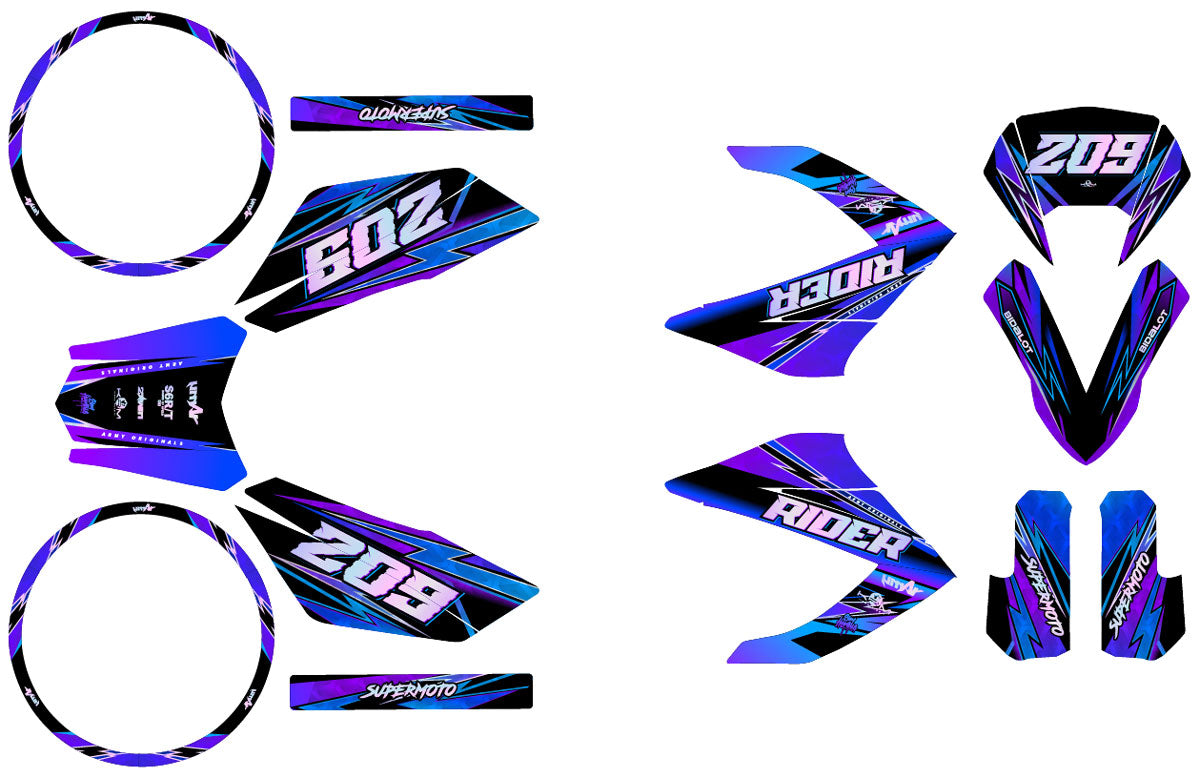 The Graphics-kit Cabrez lives up to its name. Designed for Masai Razer riders who spend more time on one wheel than two, this design breathes energy and excitement. With a striking visual style and lines that suggest vertical movement, it is the ultimate outfit for the "Bikelife."