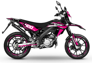 The Graphic decals Lilaks for Masai X-Ray 50cc is perfect for 50 supermotard enthusiasts looking for a sleek and bold design. Inspired by floral hues and modern patterns, this decal kit transforms your bike into a unique and refined work of art, while providing durable protection and easy installation.