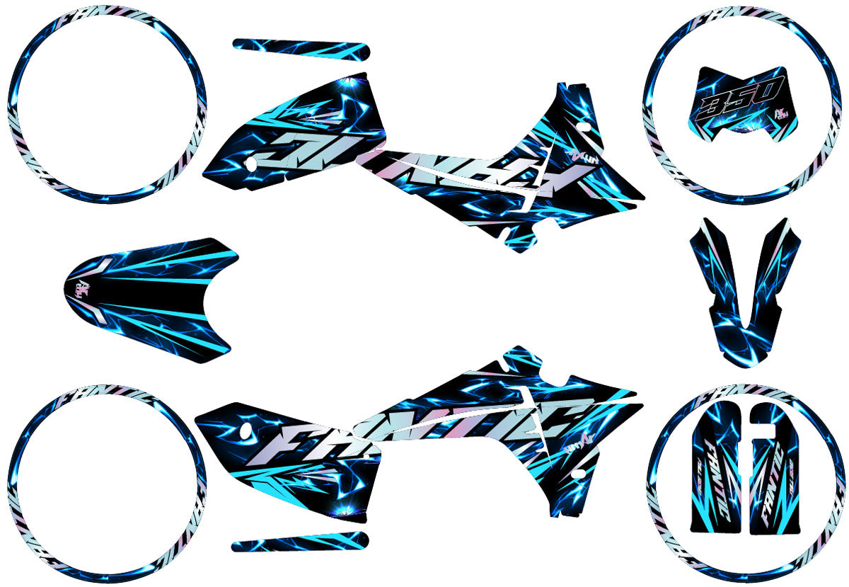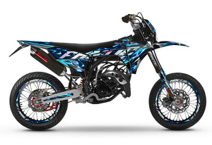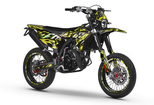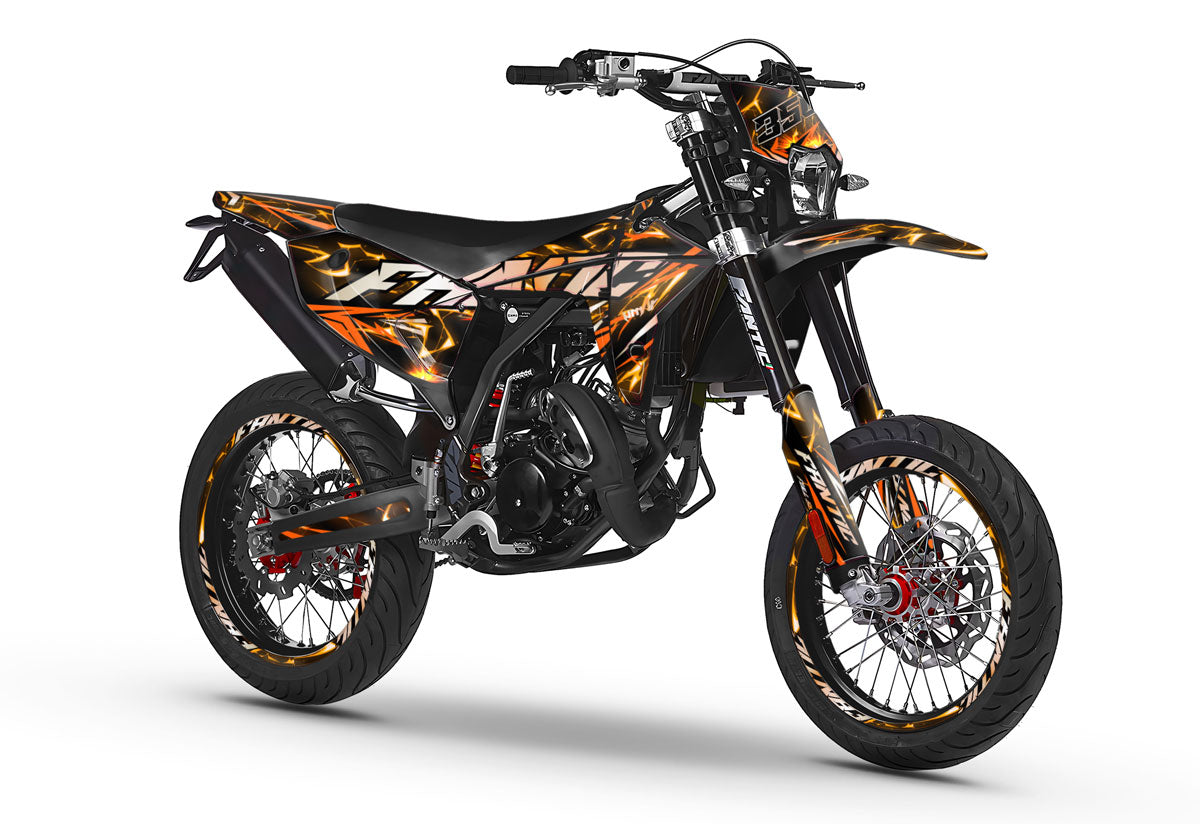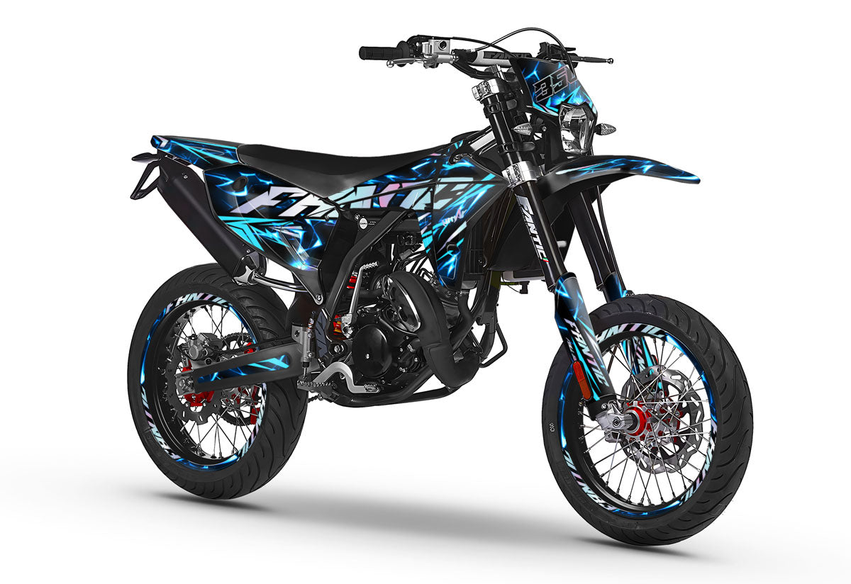 The Graphics-kit Wheelyz for Fantic 50cc (XM / XE) is the ultimate tribute to Bikelife culture. If your Fantic spends more time upright than lying down, this kit is made for you. With its striking graphics and lines that suggest movement, it gives your machine a professional "Stunt Bike" look, while respecting the quality standards of a competition motocross graphics-kit.