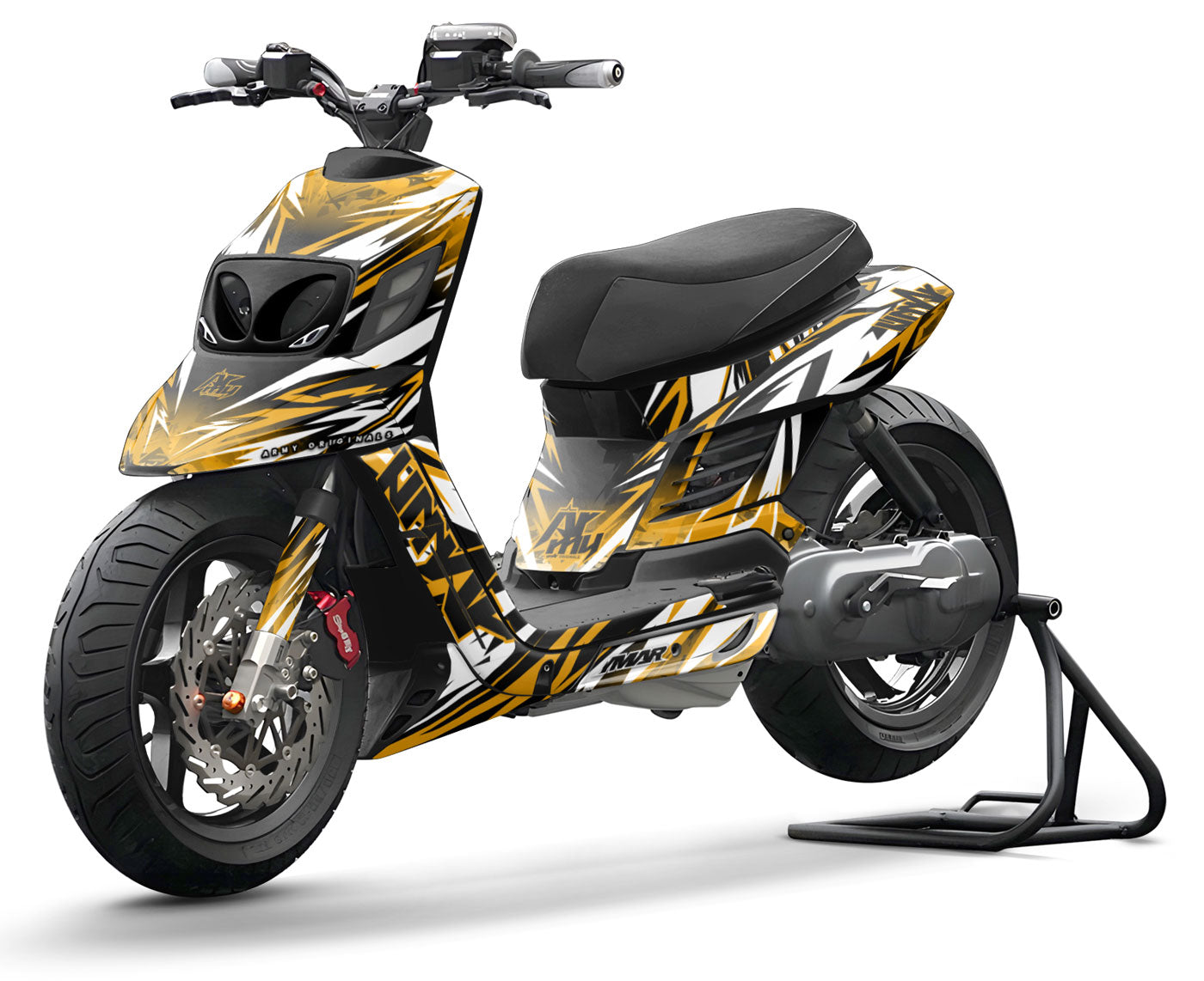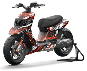 The Graphics-kit Expander was created for those who feel their scooter lacks volume. By using graphics that stretch the lines and fill the space, this design radically transforms the silhouette of your MBK Booster or Yamaha BW's equipped with BCD RX.