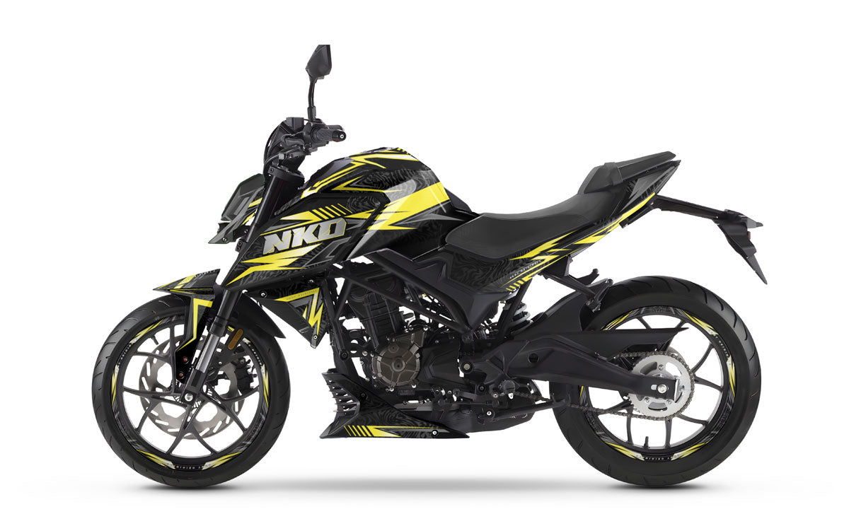 Assert your supremacy on the asphalt and take the lead of the pack with the Graphics-kit Alpha for Rieju NKD 125 (2026). Designed for riders who demand the best, this graphics-kit delivers a premium predator aesthetic, blending deep textures (forged carbon style) with sharp power lines accented with metallic touches. Made from 450-micron premium "Armor" vinyl, it withstands urban clashes and provides full protection for your plastics, while guaranteeing you the Rieju graphics most stately, dominant, and formidable look in all traffic.