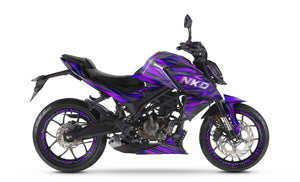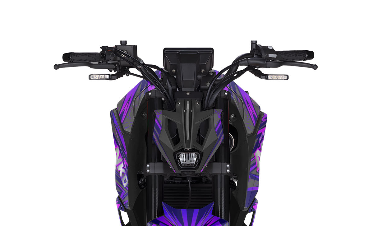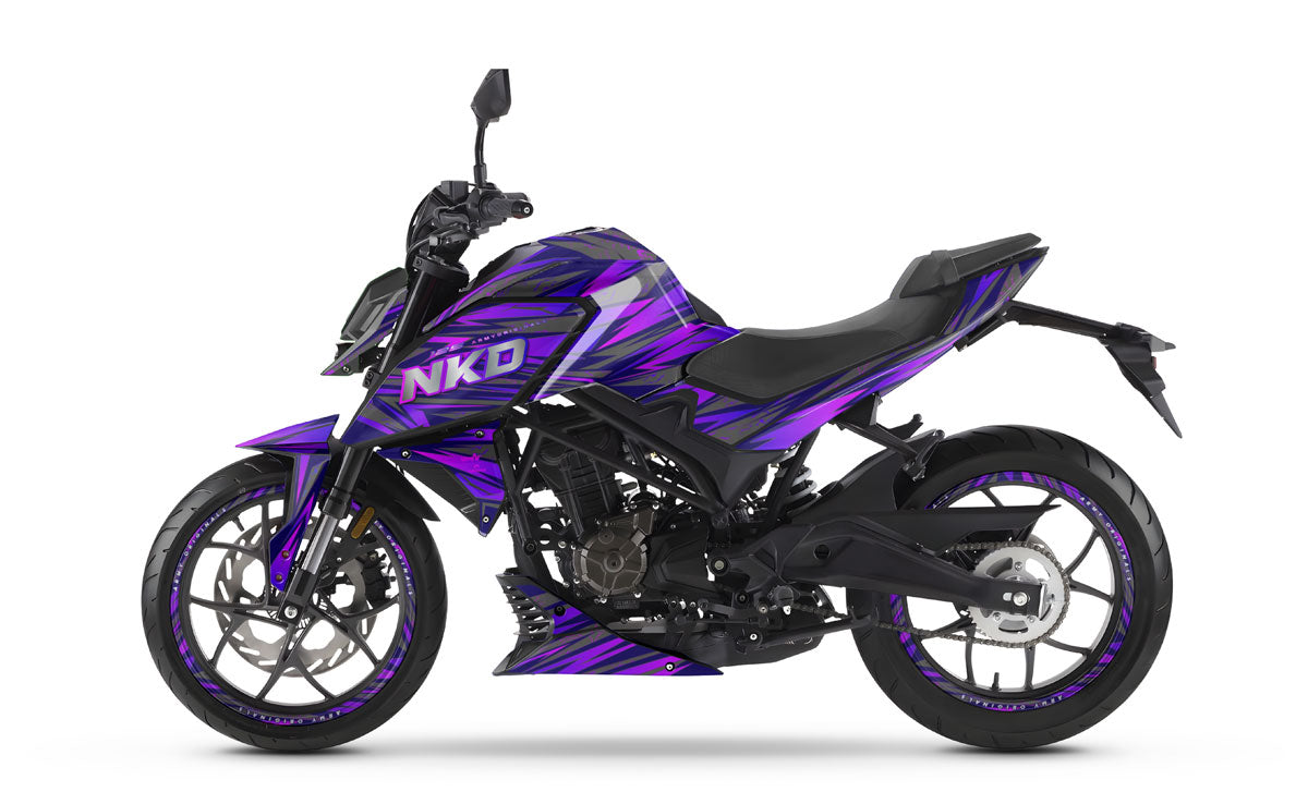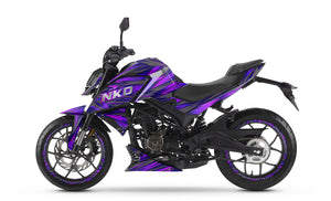 Hypnotize the street and assert your style with the Graphics-kit Purpink for Rieju NKD 125 (2026). Designed for riders who want to combine the aggressiveness of a streetfighter with a vibrant, nocturnal aesthetic, this graphics-kit unleashes an electric fusion of deep purple and neon pink on a dark background. Made from premium 450-micron "Armor" vinyl, it withstands urban clashes and provides absolute protection for your plastics, while guaranteeing you the most magnetic, trendy, and bold Rieju graphics-kit in all traffic.