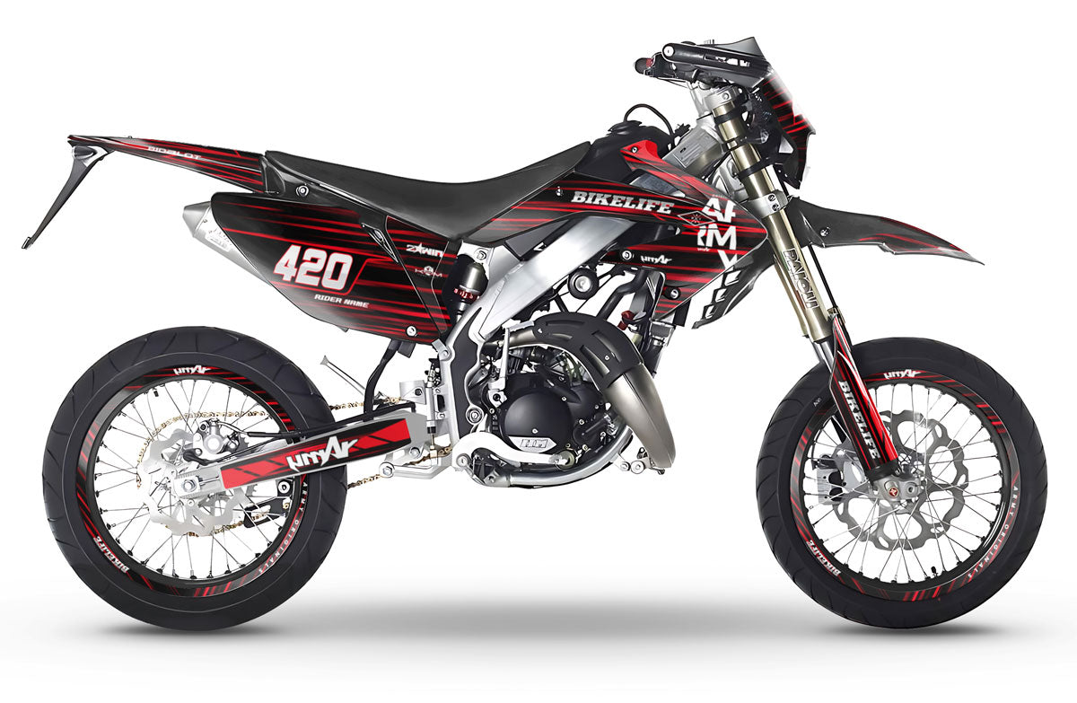 Una vez laminado, el kit pasa al corte ultra preciso gracias a plantillas optimizadas para cada modelo de moto 50cc (Derbi, Rieju, Beta, Sherco, Yamaha, Aprilia, Fantic, Gilera, Masai, Vent, etc.).