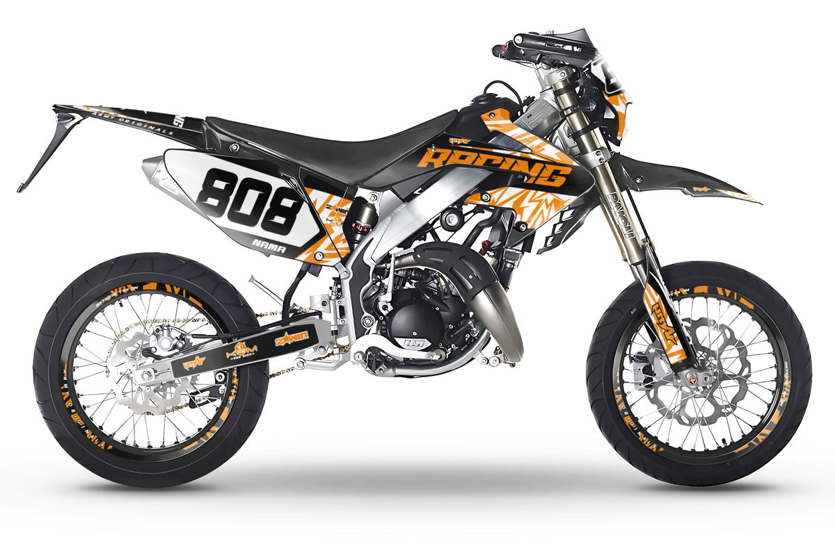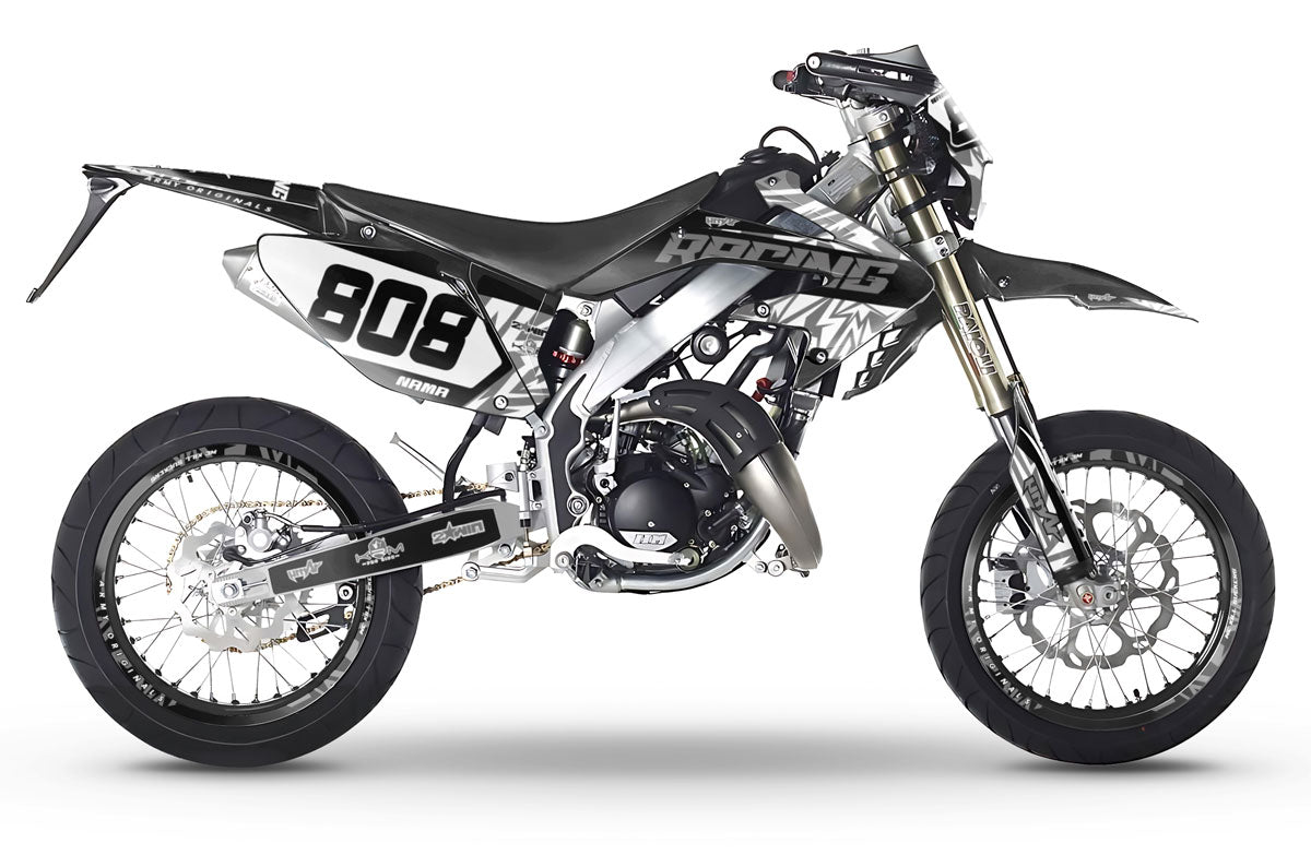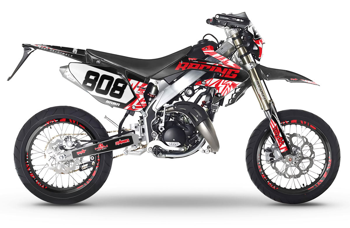 Una vez laminado, el kit pasa al corte ultra preciso gracias a plantillas optimizadas para cada modelo de moto 50cc (Derbi, Rieju, Beta, Sherco, Yamaha, Aprilia, Fantic, Gilera, Masai, Vent, etc.).