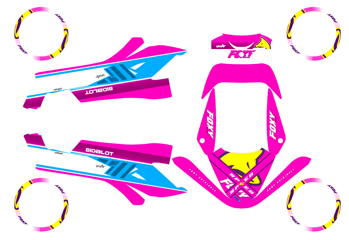 El Kit de pegatinas Pink Foxy para MBK Booster y Yamaha BW's (1990-2003) es el revestimiento definitivo para quienes no temen destacar. Al combinar un rosa eléctrico con elementos gráficos negros y blancos, este modelo crea un impacto visual inmediato que realza las curvas míticas del chasis vertical. Es la elección perfecta para modernizar un "Spirit" clásico con un toque de color audaz y un espíritu "Streetwear" afirmado.