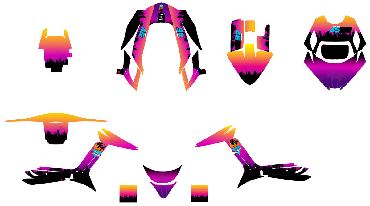 Sumérgete en el ambiente de Vice City con el Kit pegatinas MBK Booster / Yamaha BW's RX BCD edición 'Miami'. Tonos neón retro vibrantes para vestir tus carenados RX BCD. Vinilo premium para un look soleado y con estilo en tu scooter. ¡Verano todo el año!
