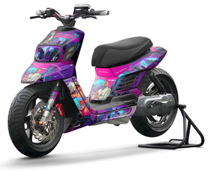 Dale un estilo urbano y contundente a tu MBK Booster RX BCD o Yamaha BW's RX BCD con el Kit de decoración de Vice City. Inspirado en la energía de las grandes metrópolis, este diseño semi-personalizado combina gráficos modernos y colores vibrantes para un aspecto dinámico y único. Fabricado con materiales ultra-resistentes, protege contra UV, rayones y condiciones climáticas adversas. Instalación rápida gracias a los cortes precisos. Disponible en acabados brillante, mate, cromo, holográfico y purpurina holográfica para una personalización elegante y audaz.