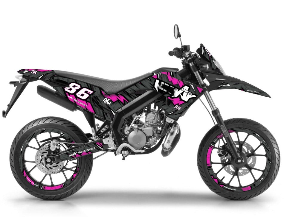 La Aprilia SX 50 es la heredera del saber hacer de Noale, y nuestros juegos de decoración están a la altura de esta reputación. Hemos desarrollado plantillas ultrafinas que cubren todas las generaciones de esta máquina icónica. Para los propietarios de Aprilia SX y RX (modelos 2006 a 2017), nuestros juegos se ajustan perfectamente a los carenados con líneas afiladas originales de Derbi. Si posee la versión más reciente, la Aprilia SX / RX (modelos 2018 a 2026), nuestros diseños incorporan las nuevas formas de las placas laterales y del guardabarros. Usando un vinilo de alta cohesión con protección UV, garantizamos que su juego no se decolorará, incluso después de años de exposición, al tiempo que protege sus plásticos contra rozaduras y salpicaduras.