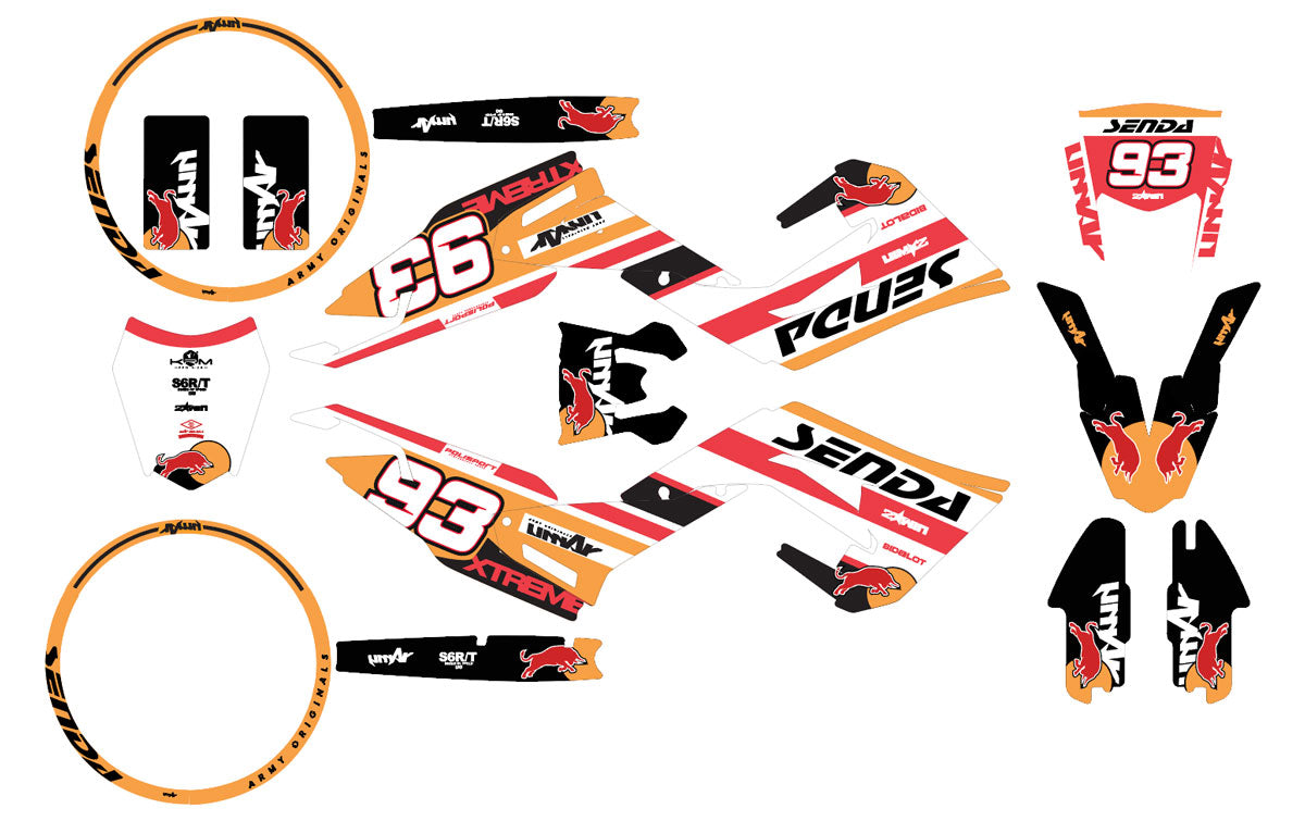 - Diseño réplica de Honda Repsol: Patrones inspirados en los colores y logotipos icónicos de Honda Repsol, con tonos de naranja, negro y blanco, para un llamativo look racing en tu Derbi Senda X-treme SM 50cc .