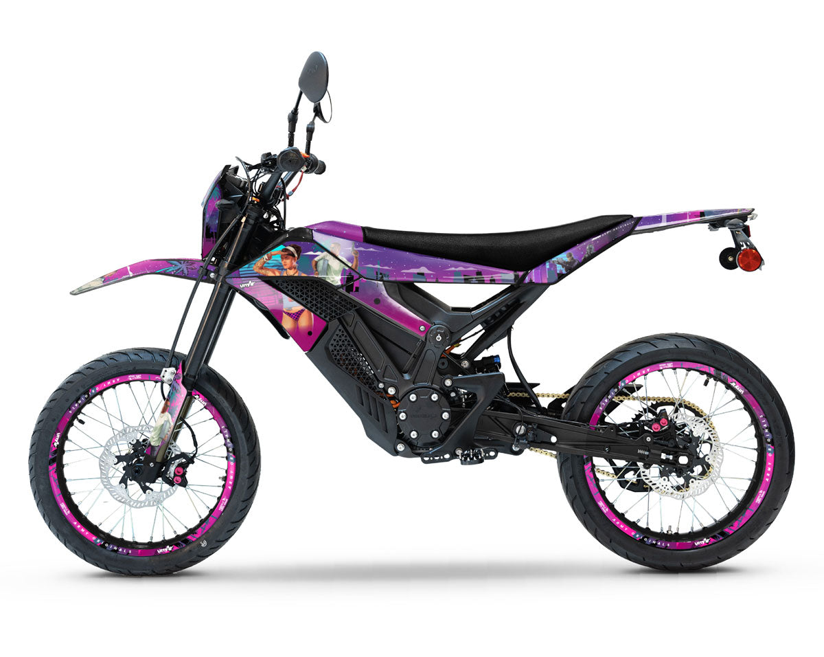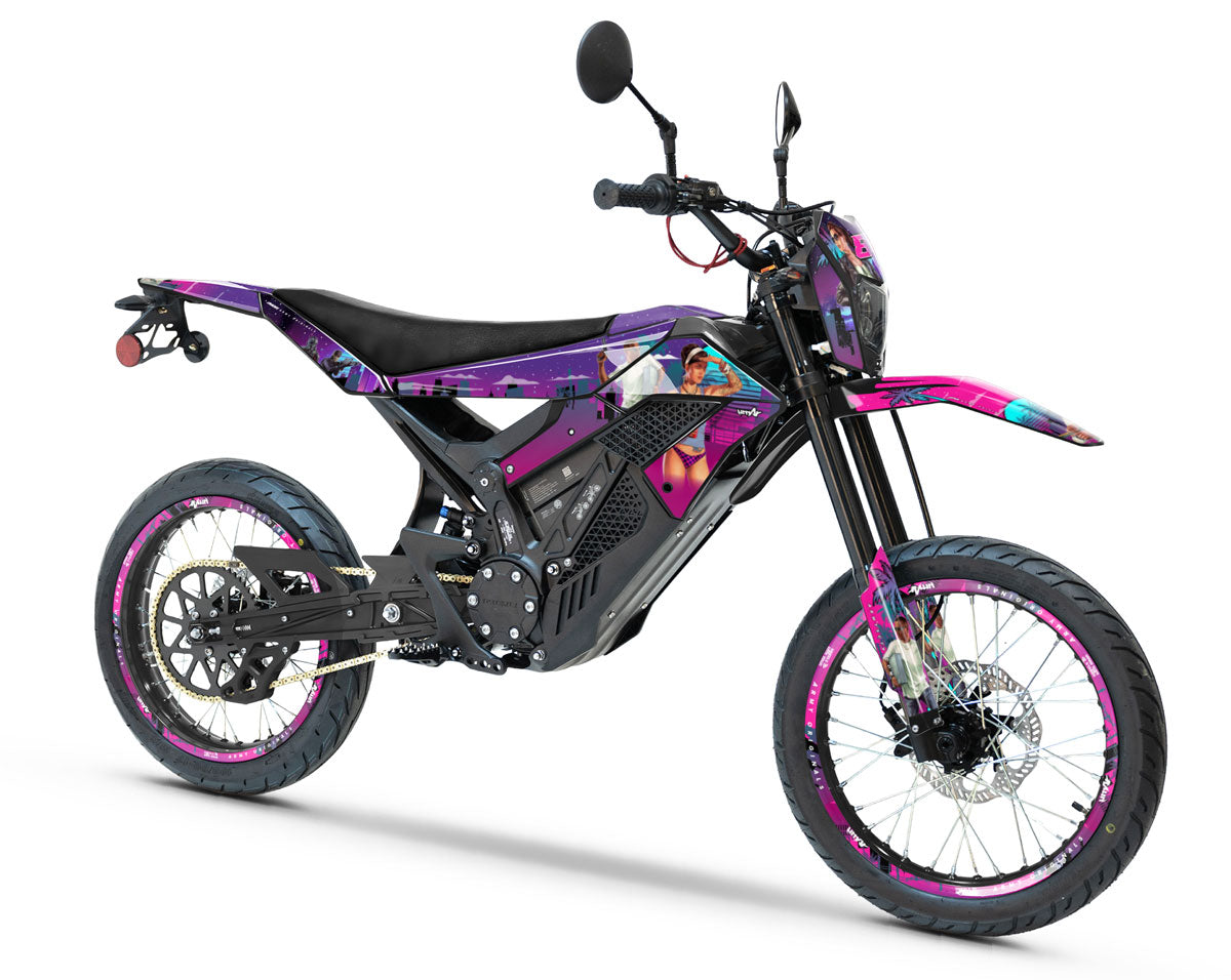 Para mantener el espíritu "Cómics" del juego, se recomienda encarecidamente el acabado Brillante: resalta los colores saturados. Para un efecto más "Vice City" bajo los neones, la opción Holográfica es increíble. El acabado Mate dará un aspecto más "Barrio" y rudo a tu motocross eléctrico.
