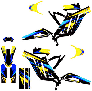 Nuestros juegos básicos incluyen las rejillas, placas, guardabarros y protecciones de horquilla. Ofrecemos como opción adicional diseños a juego para los bordes de las llantas y los brazos oscilantes para brindar una coherencia visual total a tu motocross eléctrico.