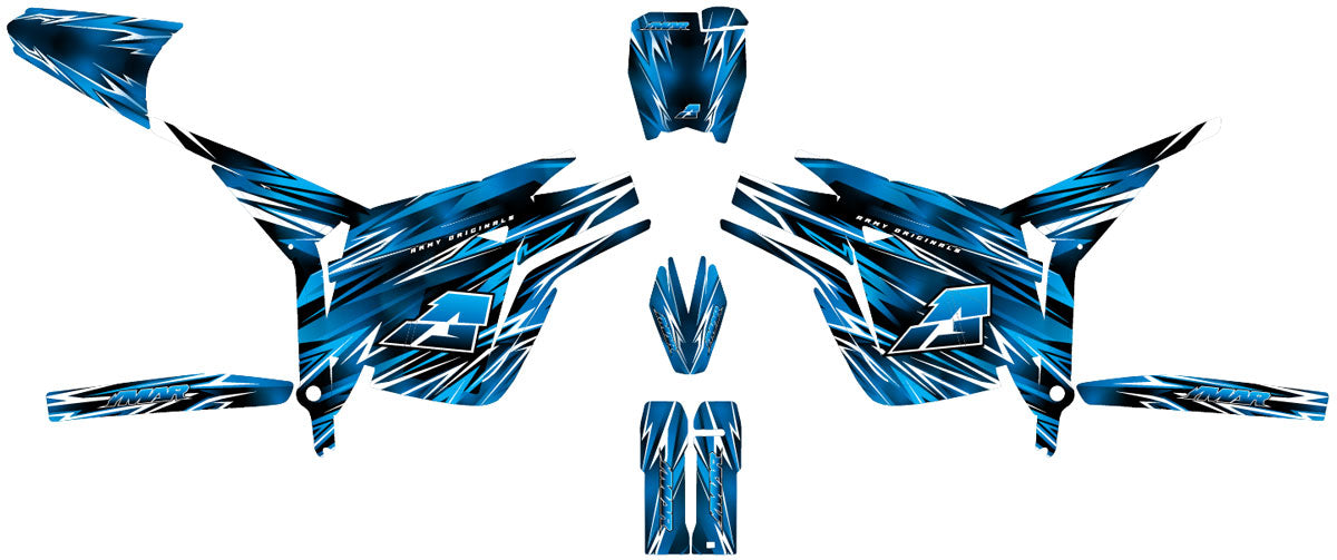 Nuestros juegos básicos incluyen las rejillas, placas, guardabarros y protecciones de horquilla. Ofrecemos como opción adicional diseños a juego para los bordes de las llantas y los brazos oscilantes para brindar una coherencia visual total a tu motocross eléctrico.