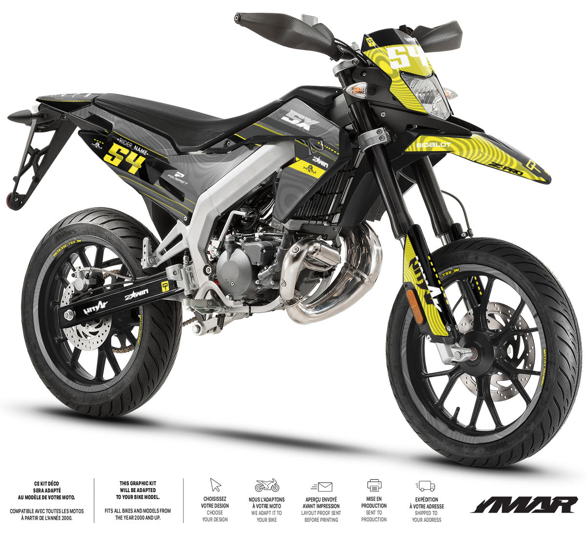 Hvert design trykkes i 8 farger med eco-solvent på premium FLO® vinyl uten bobler. Dette trinnet sikrer intense farger, høy visuell troverdighet og overlegen holdbarhet mot UV, værforhold og intensiv bruk av 50cc motorsykler.