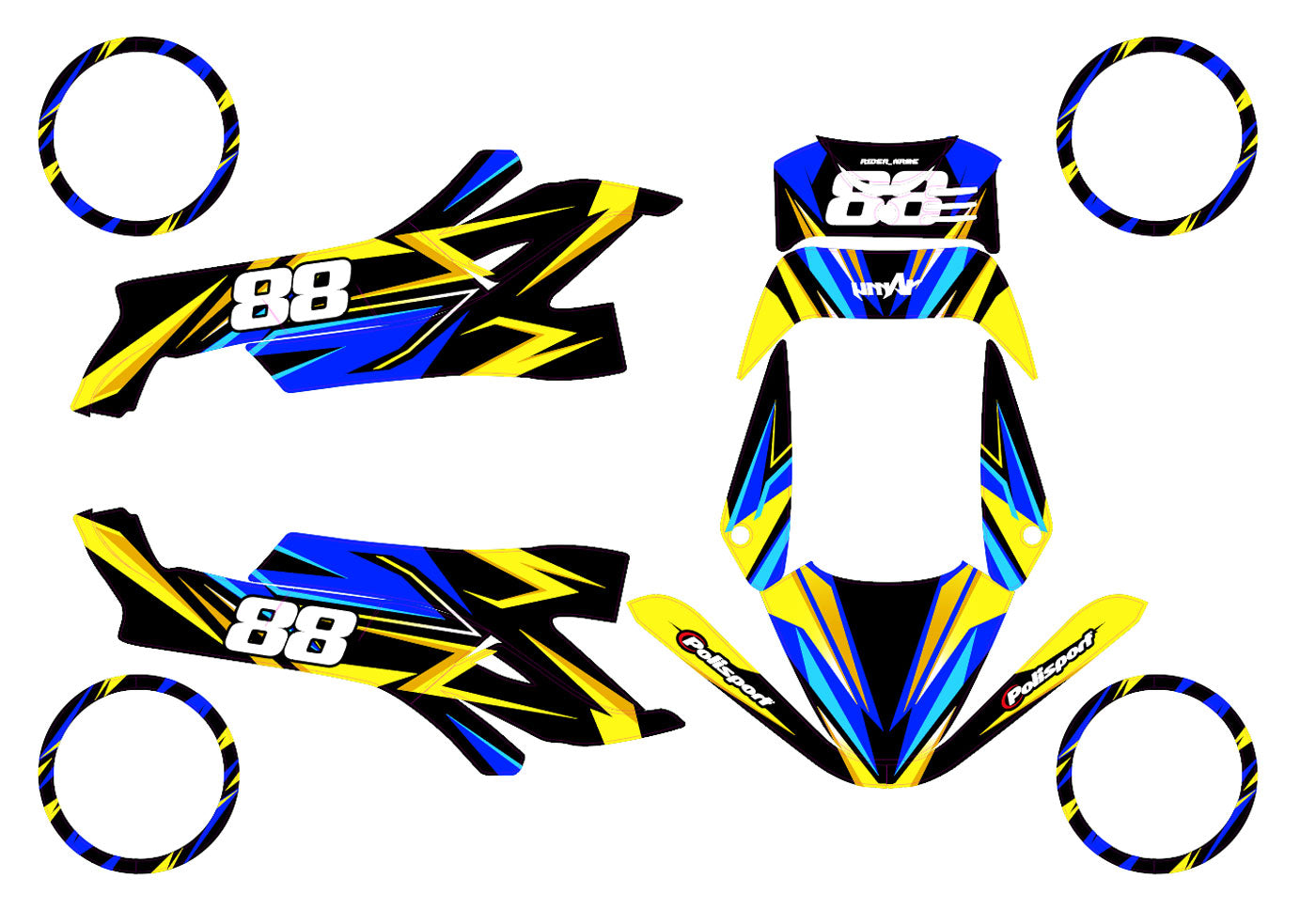 Disse tekniske egenskapene garanterer et holdbart dekorasjonssett som er enkelt å påføre og designet for å tåle både vei- og terrengkjøring.