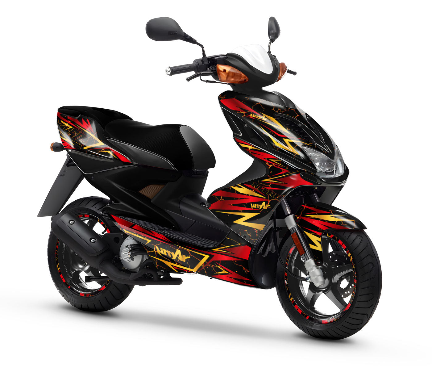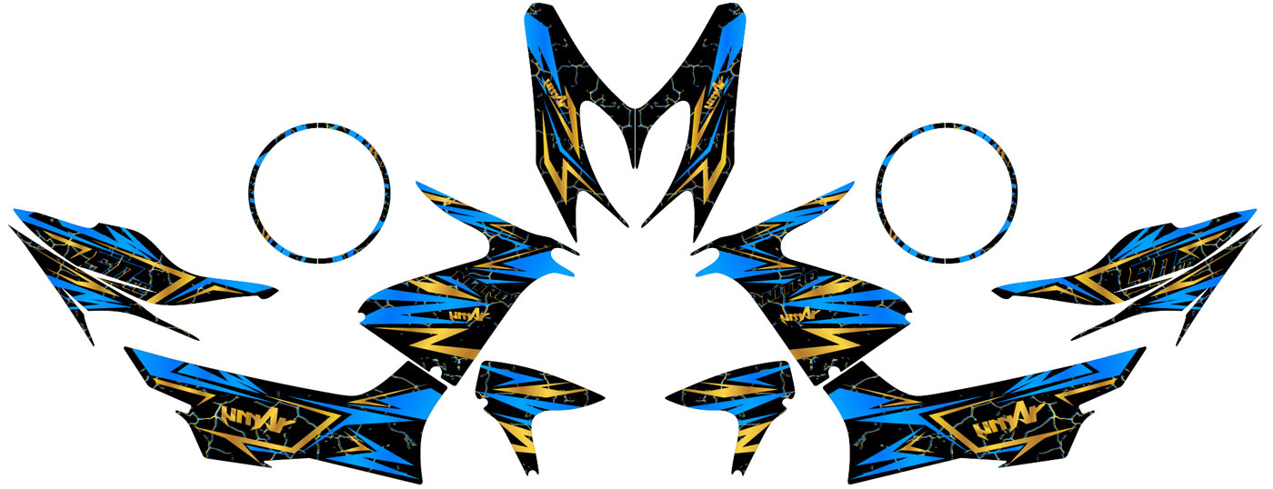 Sett ditt blir trykt på vinyl av høy kvalitet med "Air Free"-teknologi som hindrer bobler. Etter at du har valgt overflatebehandling (blank, matt eller krom), blir hver del nøye skåret ut i vårt verksted og sendt i sikker emballasje, klar til å festes på scooteren din