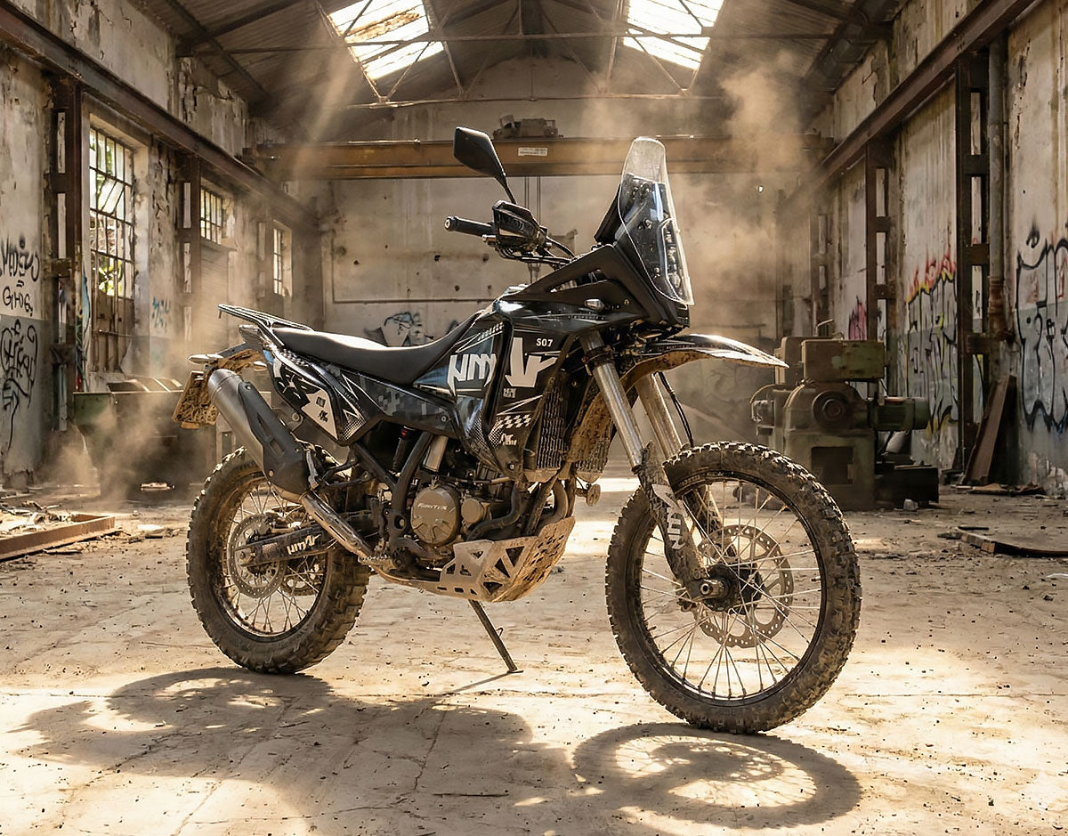 Deko-sett Domination for Rieju Aventura 307R er ikke bare til pynt. Mens 307R (lansert i januar 2026) utmerker seg med sin allsidighet, viser dette designet dens mørke og kraftfulle side. Det er den ultimate kledningen for de som kjører sin terrengsykkel som en konkurranseenduro: sterk, rask og uten nøling.