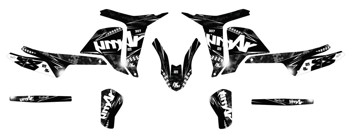 Høykvalitets dekorsett for alle dine kjøretøy: 50cc, 125cc (som her på Beta RR), Motocross, Supermotard, men også El-sykkel og Maxi Scooter. Laget med førsteklasses materialer fra ArmySCTV, sikrer våre klistremerker enkel påføring uten luftbobler og ekstrem slitestyrke. Velg et semi-tilpasset eller skreddersydd design og gi maskinen din en unik stil.