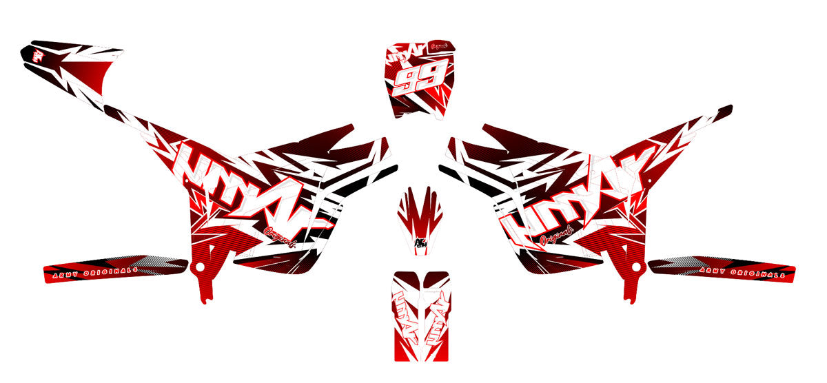 Ikke la motorsykkelen din være rå og ubehandlet. Renderz-designet forvandler Komodos flater til et levende grafisk grensesnitt. Dette er det ideelle deko-sett motocross for de som ønsker et teknisk, presist og tydelig fremtidsrettet utseende.