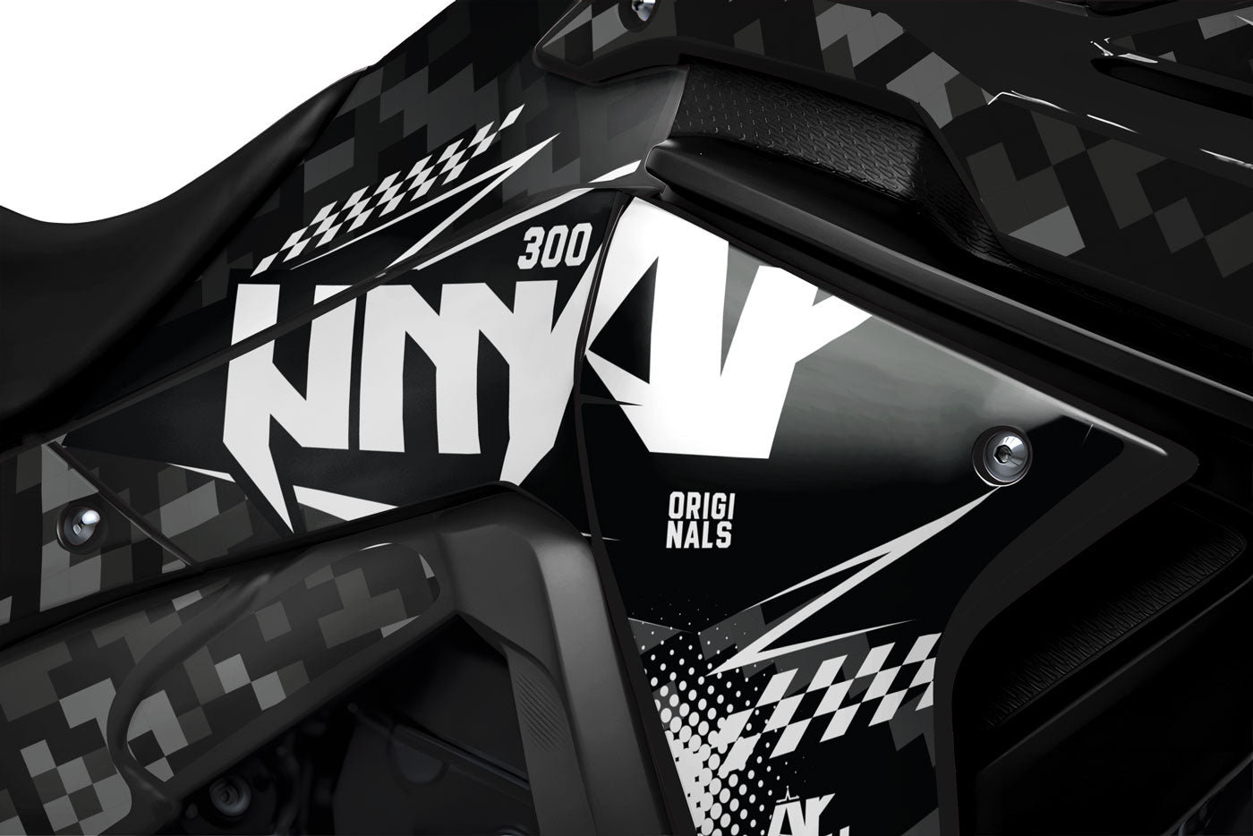 Sett dine regler for terrengkjøring og bestem dine egne vilkår med Deko-sett Domination for Voge 300 Rally (2022 til 2026). Designet for førere som nekter å inngå kompromisser, dette deko-settet viser skarpe linjer, sterke kontraster og et utseende som en absolutt rovdyr. Laget av premium "Armor" vinyl på 450 mikron, tåler det de tøffeste støtene utenfor veien og gir kraftig beskyttelse til karosseriet ditt, samtidig som det garanterer den Voge-dekoren som er mest aggressiv, karismatisk og utilnærmelig i leiren.