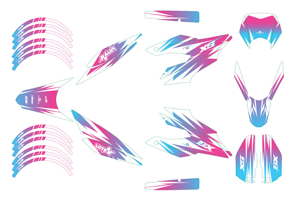 Kit déco Aprilia SX 125cc X-Fast – Dynamisez votre Aprilia SX 125cc avec le kit déco X-Fast, conçu pour les pilotes qui recherchent à la fois performance et style. Ce design audacieux combine des éléments modernes et sportifs pour apporter une touche de vitesse et de puissance à votre moto. Disponible avec des finitions brillant, mat ou paillettes, et des bases brillant, holographique ou chrome, ce kit déco est fabriqué avec des matériaux haute résistance pour un rendu parfait et durable.