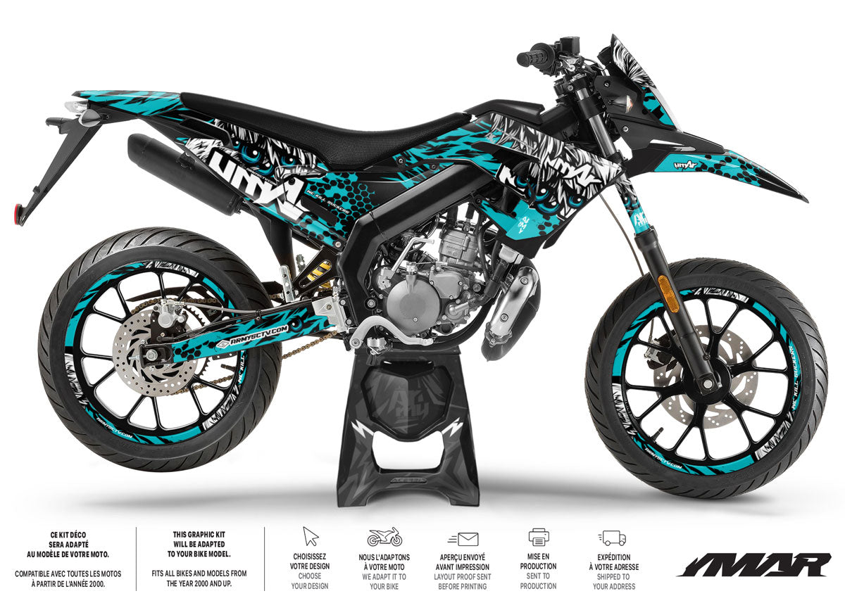 - Design Eyes : Des motifs inspirés par des yeux stylisés, combinés avec des couleurs vives et contrastées comme le bleu, le noir et le blanc, pour un look captivant et puissant sur votre Derbi Senda X-treme SM 50cc.
