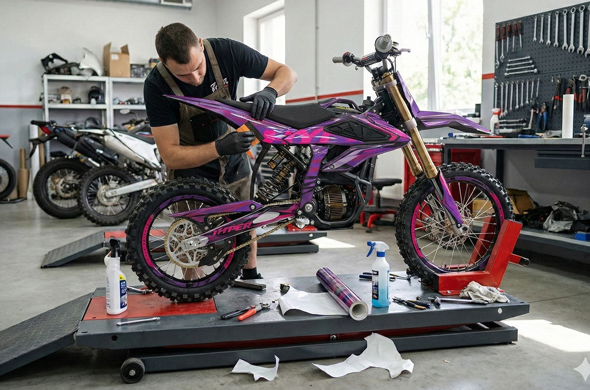 Mesurez précisément la zone à décorer sur votre kit déco moto 50cc. Utilisez un crayon non permanent pour marquer légèrement les contours et faciliter l'alignement du vinyle lors de la pose.