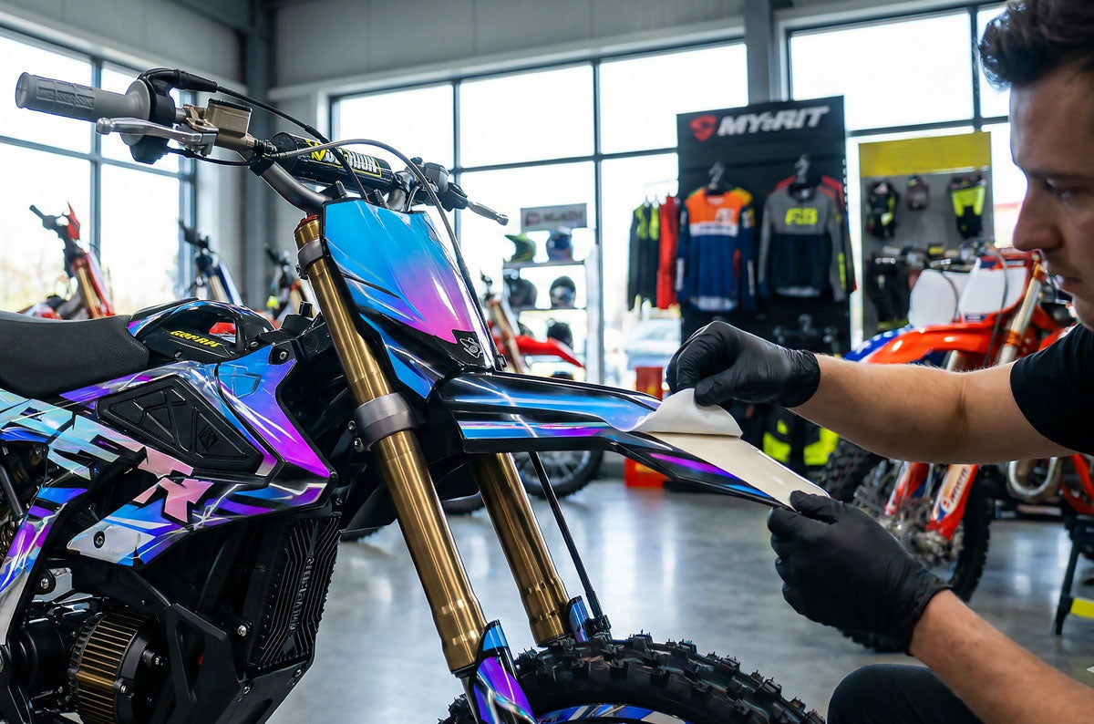 Nous utilisons un vinyle haut de gamme spécialement conçu pour les sports mécaniques extrêmes (Motocross, Enduro, Quad, Karting). Nos kits offrent une épaisseur totale comprise entre 300 et 500 microns (selon la finition choisie), garantissant une résistance optimale aux rayures, aux chocs, aux pierres et aux frottements de bottes.