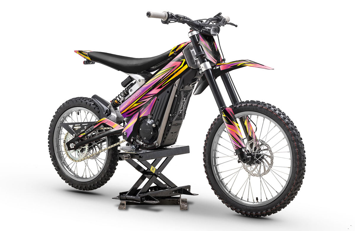 Entrez dans l'ère de la personnalisation 2.0 avec nos habillages graphiques conçus pour les références du marché de la motocross électrique. Nos techniciens ont développé des patrons de découpe exclusifs pour la gamme Talaria Sting (MX3, MX4, MX5), ainsi que pour les versions urbaines et freeride comme la Talaria XXX et la Komodo. Nous proposons également une expertise complète pour les possesseurs de Sur-Ron, avec des gabarits ajustés au millimètre pour la légendaire Light Bee, la puissante Ultra Bee et le modèle enduro Storm Bee. Nos vinyles haute performance protègent vos composants spécifiques et votre cadre des projections de pierres et de l'abrasion lors de vos sessions off-road.