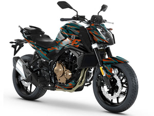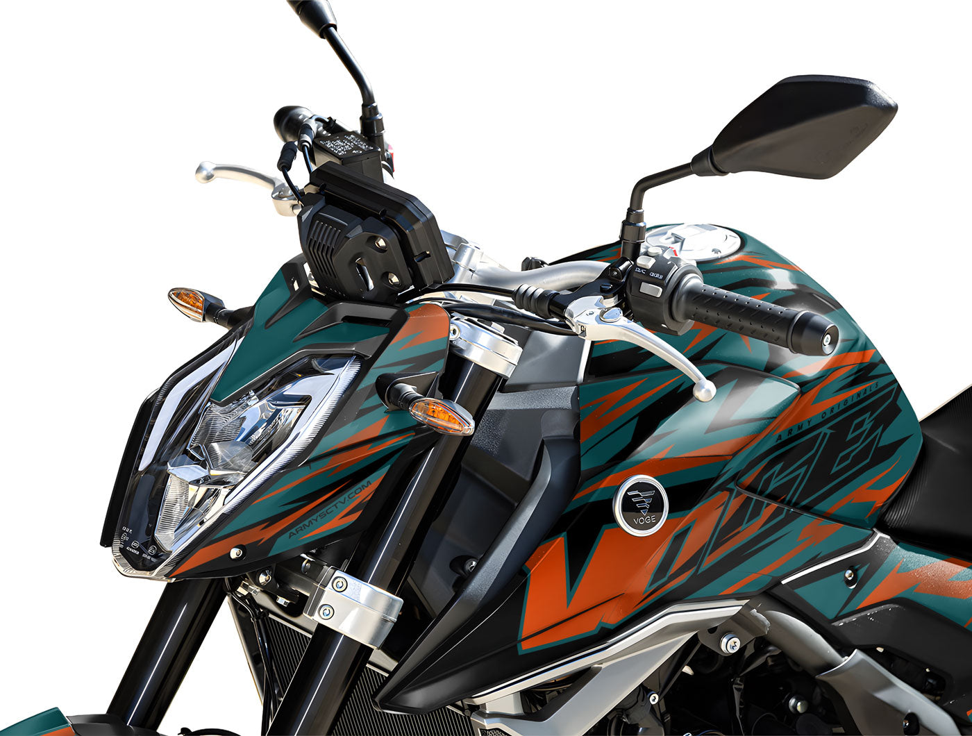 Le design Complex est fait pour être admiré de près comme de loin. Il s'appuie sur une superposition de matrices géométriques, de lignes de code visuelles et de contrastes millimétrés (Gris Titane, Noir Mat, rehaussés d'éclats fluo). C'est la déco Voge ultime pour les pilotes qui refusent les designs simplistes et veulent une machine au look infiniment riche.